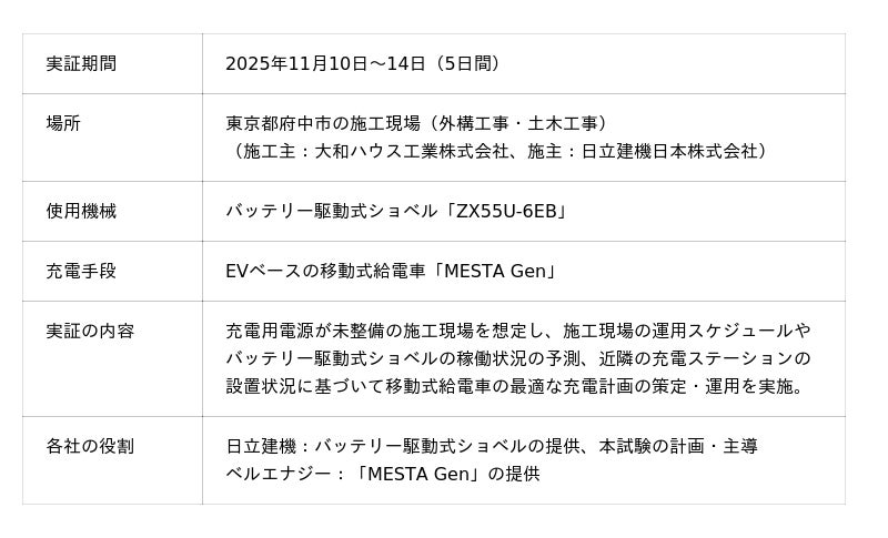 ベルエナジー株式会社(所在地:茨城県つくば市/以下、ベルエナジー)は、日立建機株式会社(所在地:東京都台東区/以下、日立建機)と共同で、2025年11月10日から14日まで、東京都府中市の施工現場において、当社の移動式給電車「MESTA Gen(メスタ・ジェン)」を活用したバッテリー駆動式ショベルへの電力供給実証試験を実施いたしました。