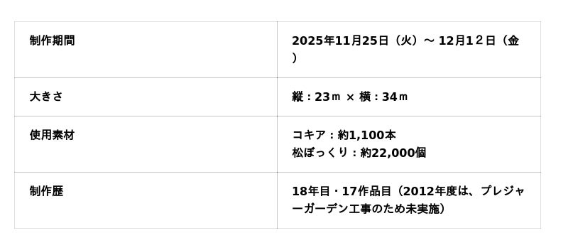 自然素材で描く 躍動的で力強い「馬」「干支の巨大地上絵」は、冬の新たな魅力づくりのため2008年度から始まり、今年で17作品目となります。巨大地上絵は、縦:23m×横:34mほどの大きさです。輪郭には薪を配置し、たてがみやしっぽには刈り取り後のコキア約600本、脚には約7,500個の松ぼっくりを敷き詰め、園内で採れた自然素材を材料に、迫力ある馬の姿を表現します。