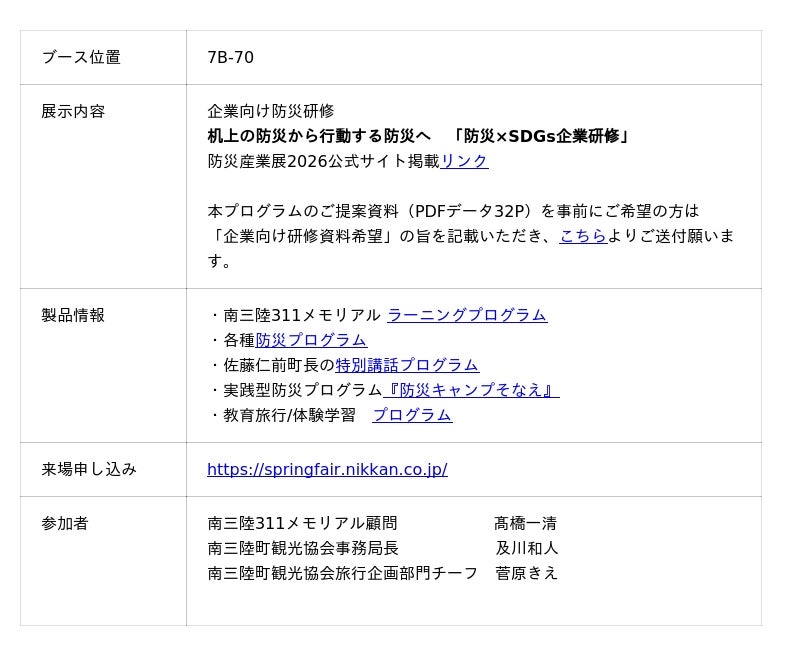 南三陸町観光協会は2026年1月28日(水)~30日(金)に「東京ビックサイト 東ホール」で開催される『防災産業展2026』に初出展します。