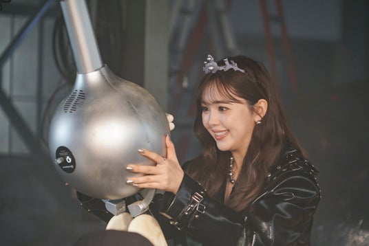 「PACHI-PACHI-QUEEN」感満点の役作りで藤田ニコルさんが登場銀玉の装飾を施したアクセサリーやエナメルのコートをまとい「PACHI-PACHI-QUEEN」らしい妖艶な雰囲気を漂わせながら撮影現場に登場した藤田ニコルさんは、工場跡地を利用した大規模な美術セットに興味津々。天井から吊るされたビッグクラッピーをみつけ「可愛いけど、かわいそう…」と優しくみつめるひと幕も。しかし突然、ビッグクラッピーが言葉を発するアクシデントが発生。「びっくりした~(笑)」と笑顔で驚く藤田さんの様子に、現場の空気がほっこりと和みました。