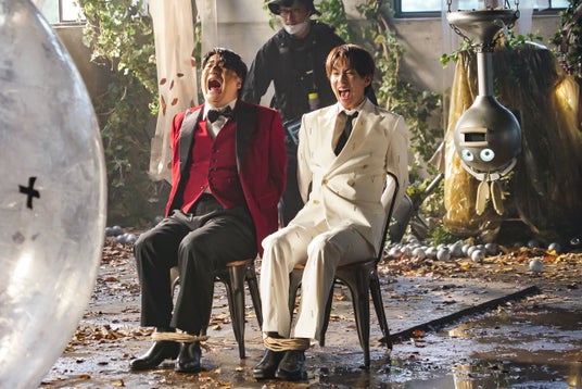 「PACHI-PACHI-7」のメンバーである、はじめしゃちょーさん、佐久間宣行さん、ビッグクラッピーは前作に続いての出演で、すでにリムジン内のシーンでも共演していたため和気あいあいとした雰囲気でした。佐久間さんがYouTubeでも活躍していることもあり、その分野で“先輩”となるはじめしゃちょーさんと話が弾んでいる様子。今作は大規模な美術セットが用意され、大人数のスタッフが関わっている撮影だったため、イスに拘束されたままの待ち時間にも「映画みたいでヤバいね」と話していました。