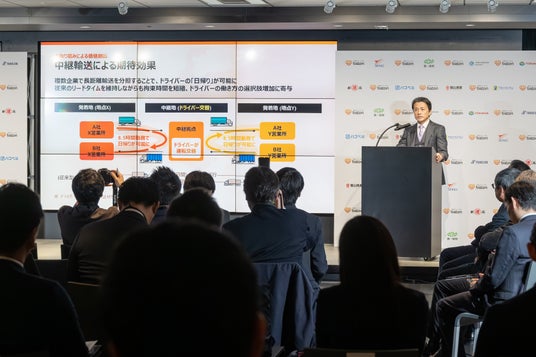 また、来年2月には、西濃運輸×福山通運、名鉄NX運輸×トナミ運輸の2組でドライバー交替方式の実証運行を開始することを発表。「協調の輪を広げ、効率的で持続可能な物流の実現を通じて社会全体の発展に貢献していきたい」と述べました。