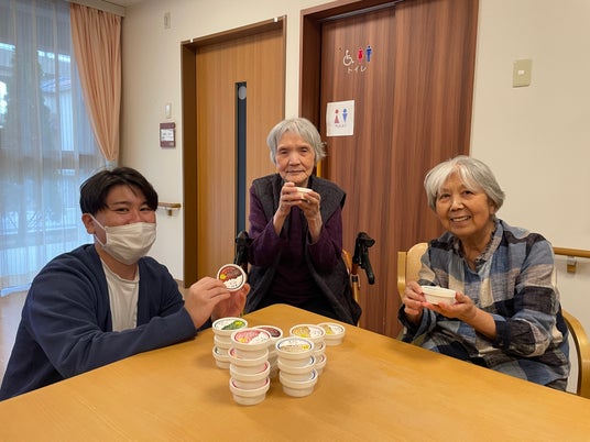 「利用者の皆さまと。久しぶりのアイスに笑顔がこぼれるひととき。」
