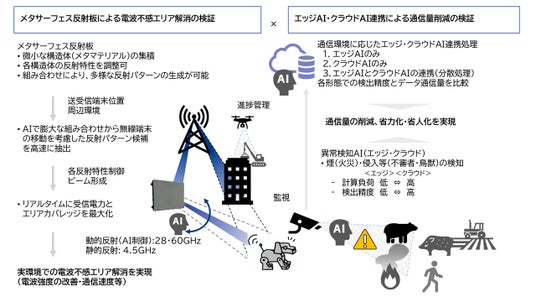 本実証では、通信環境に応じた異常検知エッジ・クラウドAI(※1)の分散処理により、通信量の削減効果を検証するとともに、メタサーフェス反射板(※2)での送受信端末位置に応じた適応的な電波反射方向制御により不感エリア解消の効果を検証します。
