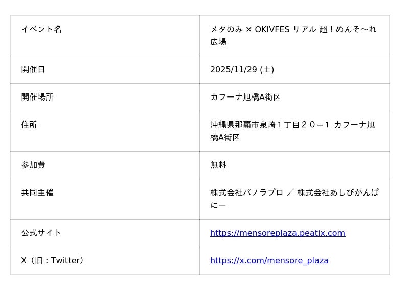 株式会社あしびかんぱにーは、XR・メタバース分野で豊富な実績を持つ株式会社パノラプロ(PANORA)との共同企画により、2025年11月29日(土)、那覇市にて、リアルとバーチャル文化が融合する新しい沖縄の祭り「超!めんそ~れ広場」を初開催いたしました。