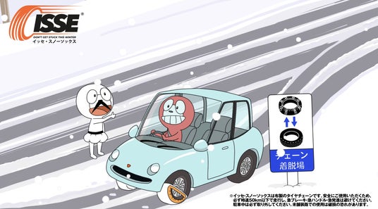 さらに、2023年からイッセ・スノーソックスのキャラクターとして愛される、赤イッセ・白イッセのCMも公開。いつも一緒の仲良し2人がドライブ中に突然降ってきた雪、、、車を止めてイッセ・スノーソックスを取り付けます。ジャッキアップも工具も不要なイッセ・スノーソックスは、急な雪にもサッと装着でき、軽くても、頼もしさ十分な冬の味方です。