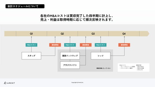 本件に伴う株式取得費用・アドバイザリー費用などの一過性のコストは、2025年6月期第3四半期に計上される想定です。一方で、レッツの売上および利益は、第4四半期からの連結取り込みを想定しています。また、今期の通期業績予想には、スタッグ社までのM&Aの影響は織り込んでいますが、建設ドットウェブ、アサクラソフト、本件レッツの3社については織り込んでいません。現在、これらを踏まえた計画の精査を進めており、必要があれば速やかに開示を行います。
