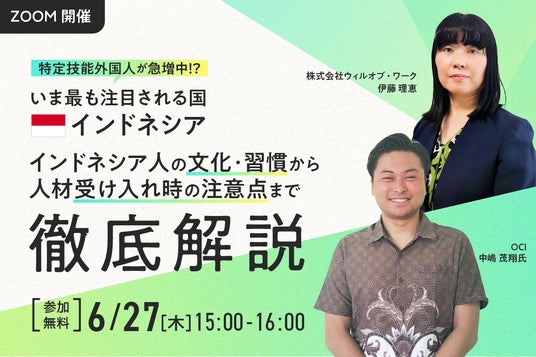 ウィルグループの総合人材サービスを手掛ける株式会社ウィルオブ・ワーク(本社:東京都新宿区、代表取締役社長:村上 秀夫)は、無料オンラインセミナー『特定技能外国人が急増中!?いま最も注目される国~インドネシア人材の文化・習慣から受け入れ時の注意点までを徹底解説~』を、2024年6月27日(火)に開催します。