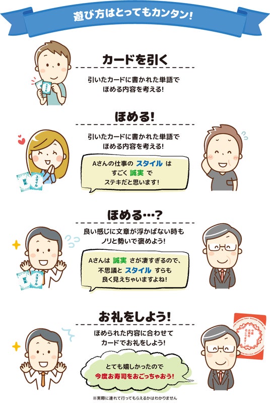 もちろん、学校の友人や気心の知れた長年の友人と一緒にトランプのような一般的なカードゲームの代わりに遊んでも、とても楽しめるゲームだと思います。しかし、「ほめじょーず」の特徴はゲームという手段を使って「重すぎずに、軽く、冗談めかして相手を褒めることができる」点にあります。