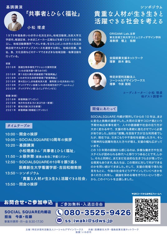 2024年11月9日(土)、NPO法人ソーシャルデザインワークス(福島県いわき市・代表理事 北山 剛)は運営するSOCIAL SQUARE内郷店の開所10周年を迎えるにあたり、「災害とコロナを越えて:10年の支援と多様性を考える」記念イベントを開催いたします。この10年間に経験した多様な課題や変革を振り返り、未来の社会における多様性と共生のあり方を共に考える場といたします。皆さまのご参加を心よりお待ち申し上げます。
