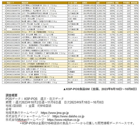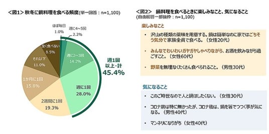 10月に入り次第に秋の兆しを感じられる気候になってきました。気温の低下とともに鍋メニューを選択される方が増加し、週1回以上鍋を食べる方が45%にもなります。 “野菜をたくさん食べたい”“温まりたい”ということが大きなニーズです。近年では個食タイプの鍋つゆの浸透を受けて、“おひとり鍋”の需要も拡大しています。