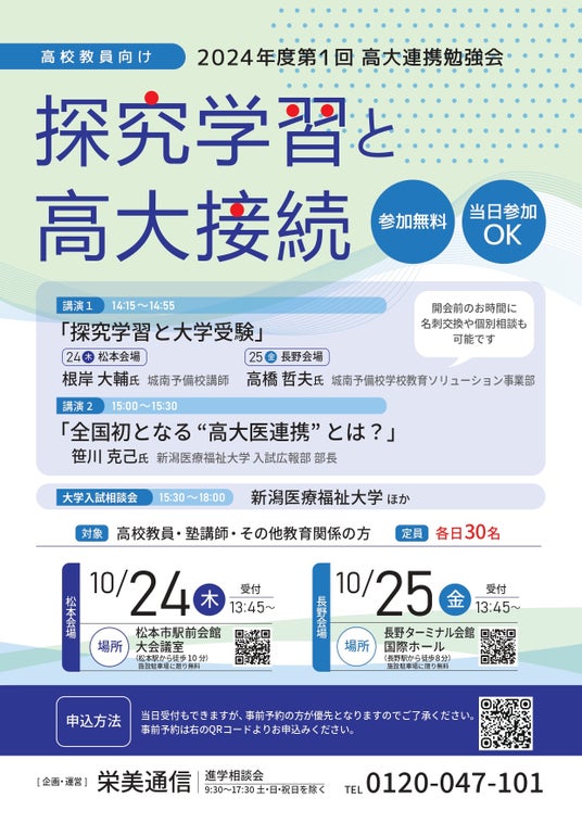 NSGグループの新潟医療福祉大学は、10月24日(木)と25日(金)、長野県の2都市で、「探究学習と高大接続」をテーマに高校教員などを対象とした「高大連携勉強会」を開催します。
