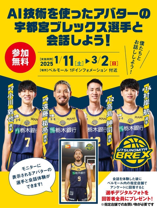 この度、株式会社栃木ブレックスは、宇都宮市の「スポーツを活用したまちづくりに資するモデル事業」の一環として行われる「スポーツ選手のアバターとのAIを活用した映像対話に関する実証実験」にKPMGコンサルティング株式会社(本社:東京都千代田区、代表取締役:関 穣、田口 篤、知野 雅彦、以下、KPMGコンサルティング)、株式会社シルバコンパス(本社:静岡県浜松市、代表取締役:安田 晴彦、以下「シルバコンパス」)、株式会社ベルモール(本社:栃木県宇都宮市、代表取締役社長:鈴木 一雄、以下「ベルモール」)とともに参画しますのでお知らせします。