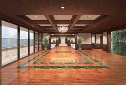暖色を基調としたエントランスホールは入居者様を温かく迎え入れ、心に安らぎを与えてくれます。また差し色の緑が映える噴水のオブジェを設置し、ヨーロピアン調の調度品を配置することで中世ヨーロッパを彷彿とさせる高級感溢れる空間を演出しています。