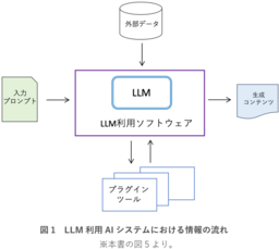 今回発行した生成AI向け品質マネジメントガイドライン(以下「本書」という)が対象とするのは、主としてLLMなどの汎用基盤モデルを部品として用い、ある想定用途のために設計、開発されるLLM利用AIシステムです。このシステムを実現するアーキテクチャの前提となる情報の流れを図1に示します。