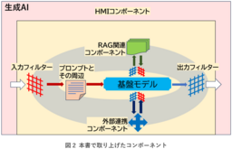 本書では主なコンポーネントとして、基盤モデル以外に、プロンプトとその周辺、RAG関連コンポーネント、外部連携コンポーネント、入力フィルター、出力フィルター、そしてHMIコンポーネントを取り上げます(図2)。
