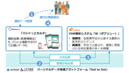 生活者はArteryexの「パシャっとカルテ(注2)」を用いて紙の健康診断結果をスマートフォンで撮影するだけで、ウェルクルの「W(ダブリュー)(注3)」が分析した各種学会基準などに基づく判定結果やその個人にあった健康情報を「パシャっとカルテ」上で確認することができます。生活習慣病予防につながる健康アドバイスが提示され、これを生活改善に生かすことで、効率的な健康管理を実現できます。本サービスは、BIPROGYと三井不動産が共同開発した「Dot to Dot(注4)」でパーソナルデータを安全に連携することで、両サービスの特徴を生かした新たなサービスを生み出し、プライバシー保護とパーソナルデータの利活用を両立させています。