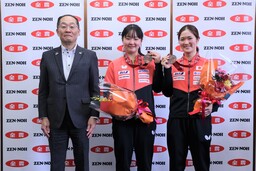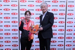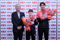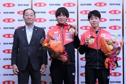 また代表理事専務の安田忠孝と齊藤良樹から今大会で見事メダルを獲得した7名の選手にお祝いの花束を贈呈しました。女子シングルスで銅メダルを獲得した伊藤美誠選手(スターツ)、男子ダブルスで金メダルを獲得した戸上隼輔選手(井村屋グループ)と篠塚大登選手(愛知工業大学)、混合ダブルスで銀メダルを獲得した吉村真晴選手(SCOグループ)と大藤沙月選手(ミキハウス)、女子ダブルスで銅メダルを獲得した張本美和選手(木下グループ)と木原美悠選手(個人)は花束を受け取り、笑顔を見せました。