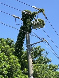 例年、初夏にかけて、電線や電柱などの電力設備に“つる・ツタ”が巻き付き、高圧機器等と接することで停電が発生する事があります。この停電を未然に防ぐため、中部電力パワーグリッドでは、つる巻き防止器※の設置に加え、毎年1回管内全域での巡視を行い、停電が発生する恐れがある場所の“つる・ツタ”を伐採するなどの対策を取っています。