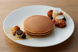 「林檎のタタンのパンケーキ」は、タルトタタンのアップルフィリングや、いちじく、キャラメル風味のホイップクリーム、クルミ入りのメレンゲなどを添えてご提供いたします。キャラメリゼしたアップルフィリングのほどよい苦みがアクセントです。