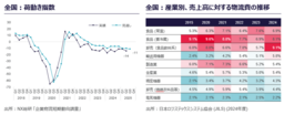 2025年6月時点での貨物輸送量(1)は、輸送トン数ベースで、前年同月比7.1%減、輸送トンキロベースで0.1%減を記録した。NX総研の荷動き指数は2023年第1四半期以降、9四半期連続で2桁のマイナスを記録。2025年第3四半期の見通しも-11ポイントと、前期からさらに悪化する見通しとなっている。輸送能力は慢性的な人手不足により制限され、物価上昇による個人消費の冷え込み、建設費高騰に伴う新設住宅着工数や公共工事の減少が重なり、物流需要の回復を阻んでいる。さらに、企業のコスト負担も増しており、産業別売上高(2)に対する物流費は過去12ヵ月で全体的に上昇、特に食料飲料系卸売分野では2023年の5.7%から2024年には9.1%へと増加。食品(要冷・常温)分野では、電気料金・エネルギー価格高騰による倉庫運営費値上げの要請に応えたとの回答もあり、裏を返せば、物流事業者からの価格転嫁が一定程度進んだ結果といえる。日米間で合意された「トランプ関税」の影響は、特に自動車関連、機械関連、鉄鋼をはじめとして、現時点では未知数となっている。