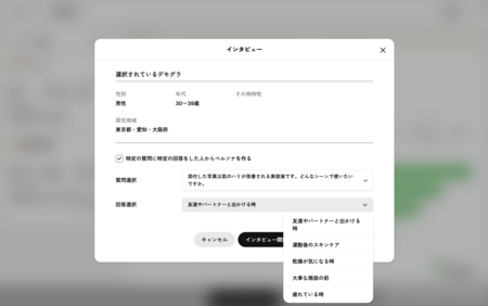 AIQQQ TALKと連携することで自動的にペルソナ情報を抽出。そのセグメントの代表者に対して1対1のインタビューを実施することで、生活者の深層心理や行動背景を深く探ることが可能です。これまで数日間かかっていたインタビューまでの時間を、数分から数時間に短縮することができます。