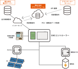 アグリゲーターからの指令はアービトラージ制御と需給調整市場の充放電制御を弊社クラウドでAPI連携で受け、現地EMSコントローラーに指令を送信します。