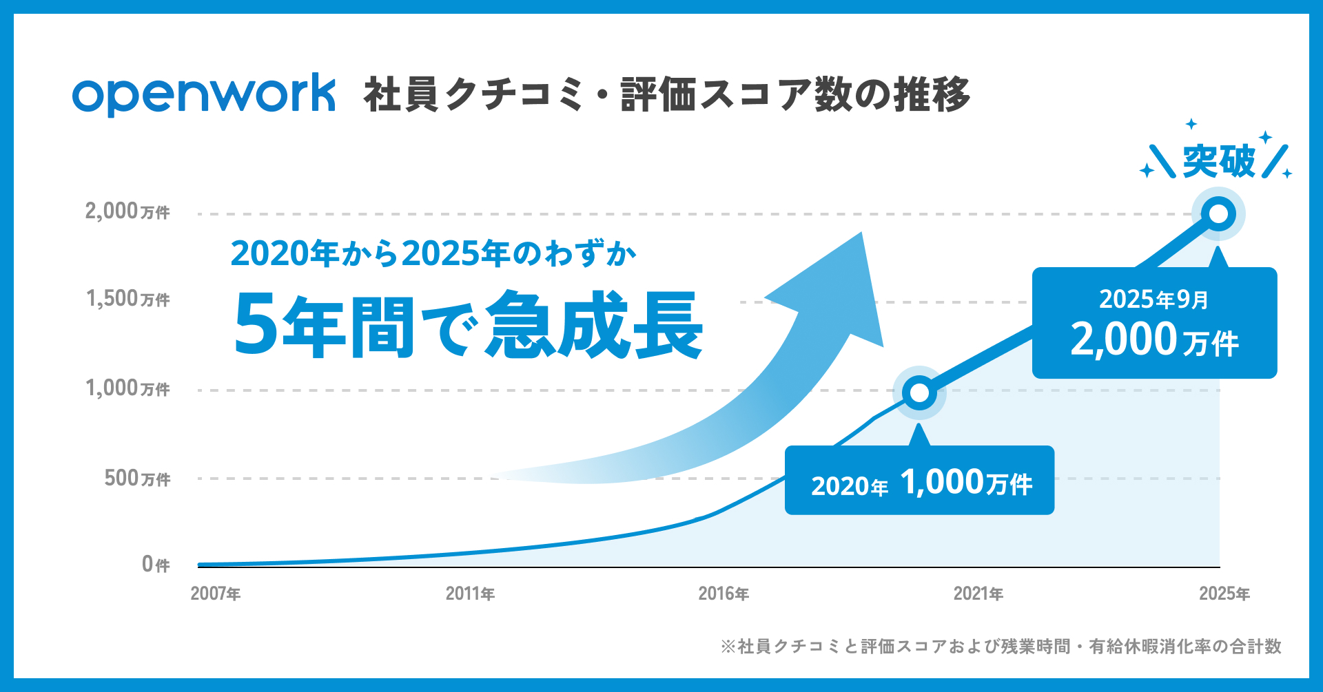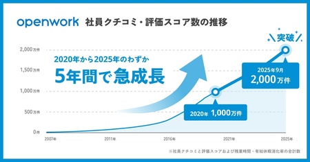 転職・就職のための情報プラットフォーム「OpenWork」を運営するオープンワーク株式会社(所在地:東京都渋谷区、代表取締役:大澤陽樹)は、2025年9月末時点でOpenWorkに投稿された「社員クチコミ数」(※1) が2,000万件を突破したことを発表いたします。