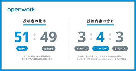 こうした取り組みにより、OpenWorkのクチコミは現職者と退職者の比率がほぼ半数ずつ(51:49)を占めています。投稿内容のトーンも「ポジティブ:30%」「ニュートラル:40%」「ネガティブ:30%」と分布が均衡しており、特定の声に偏らないフラットなプラットフォームであることが特徴です。