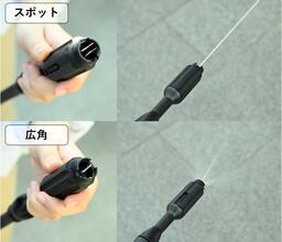 ノズルの先端を回転させるだけで水流の種類を「スポット」「広角」へと簡単に切り替えることができるため、用途に応じた最適な洗浄が可能に。「延長ランス」※3が付属しているため、手が届きにくい高い場所の汚れにもスムーズに対応できます。
