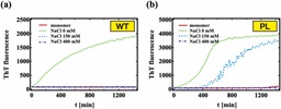 図3:チオフラビンT(ThT)蛍光測定(注6)の結果。NaClを添加すると、野生型では線維化しなくなり、変異型でも線維化がかなり抑制されることがわかった。