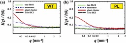 図2:野生型(WT)と変異型(P301L)のX線小角散乱の結果。ヘパリンを入れると、小角(qの小さい方)の散乱が大きくなっていることがわかった。これが前駆体クラスターに対応している。
