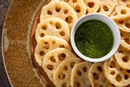「千葉県産蓮根のフリット 春菊とオリーブのジェノベーゼソース」