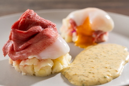 素早く出汁にくぐらせた柔らかくジューシーなブラックオパールビーフととろける食感のポーチドエッグの相性が抜群。お好みのソースでお召し上がりください。