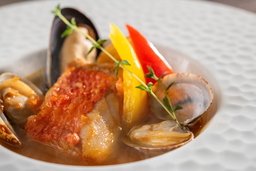 皮目をパリッと香ばしく焼き上げた金目鯛に、魚介の旨味あふれるブイヤベースソースを合わせた、