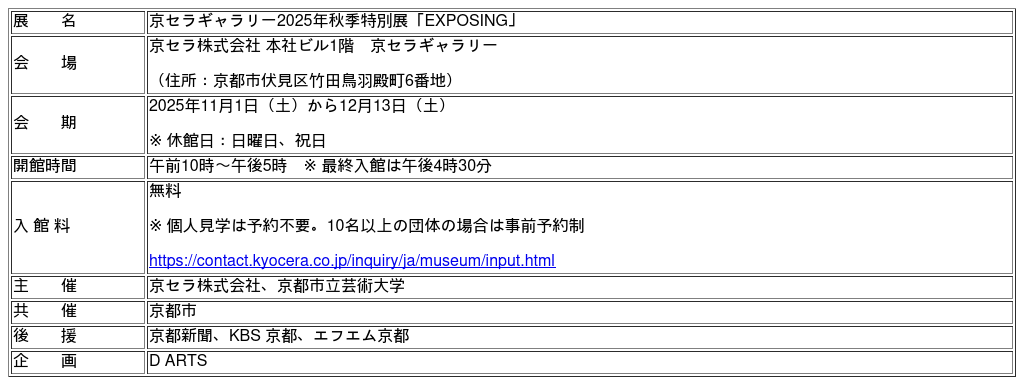 京セラ株式会社(代表取締役社長:谷本 秀夫)は、社会貢献活動の一環として開設している京セラギャラリー(京都市伏見区、京セラ本社ビル1階)において、2025年11月1日(土)から12月13日(土)まで、京都市立芸術大学(学長:小山田 徹)と共同で、2025年秋季特別展「EXPOSING」を開催しますので、お知らせします。