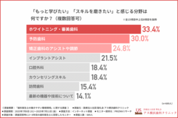 「「もっと学びたい」「スキルを磨きたい」と感じる分野」について尋ねたところ、『ホワイトニング・審美歯科(33.4%)』が最も多く、『予防歯科(30.0%)』『矯正歯科のアシストや調節(24.8%)』と続きました。