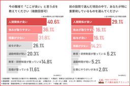 次に「今の職場で良いと思う点」について尋ねたところ、『人間関係が良い(40.6%)』が最も多く、『休みが取りやすい(36.1%)』『残業が少ない(31.8%)』『給与が良い(26.1%)』と続きました。