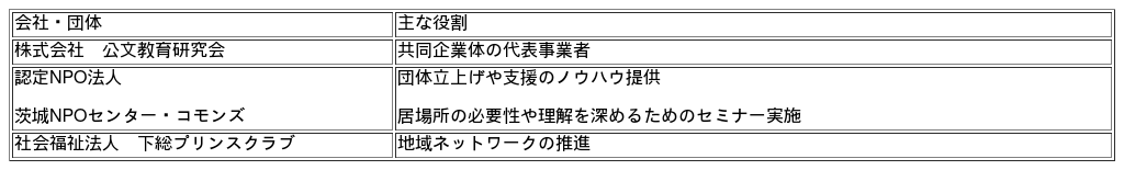 事業体は、KUMON、認定非営利法人茨城NPOセンター・コモンズ(代表理事:横田 能洋)、社会福祉法人下総プリンスクラブ(理事長:宇田 明良)、により構成。資金提供者である株式会社日本政策投資銀行と株式会社常陽銀行による、資金調達を受け、各事業者の強みを生かしたこどもの居場所支援事業を推進していきます。
