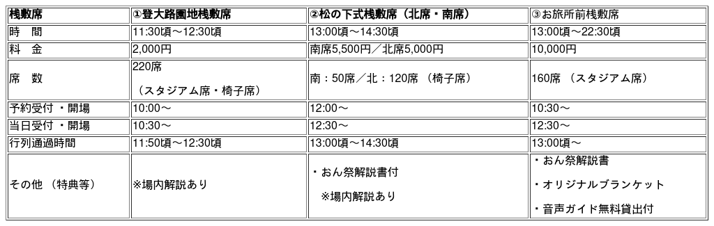桟敷席:①登大路園地桟敷席、②松の下式桟敷席(南席・北席)、③お旅所前桟敷席