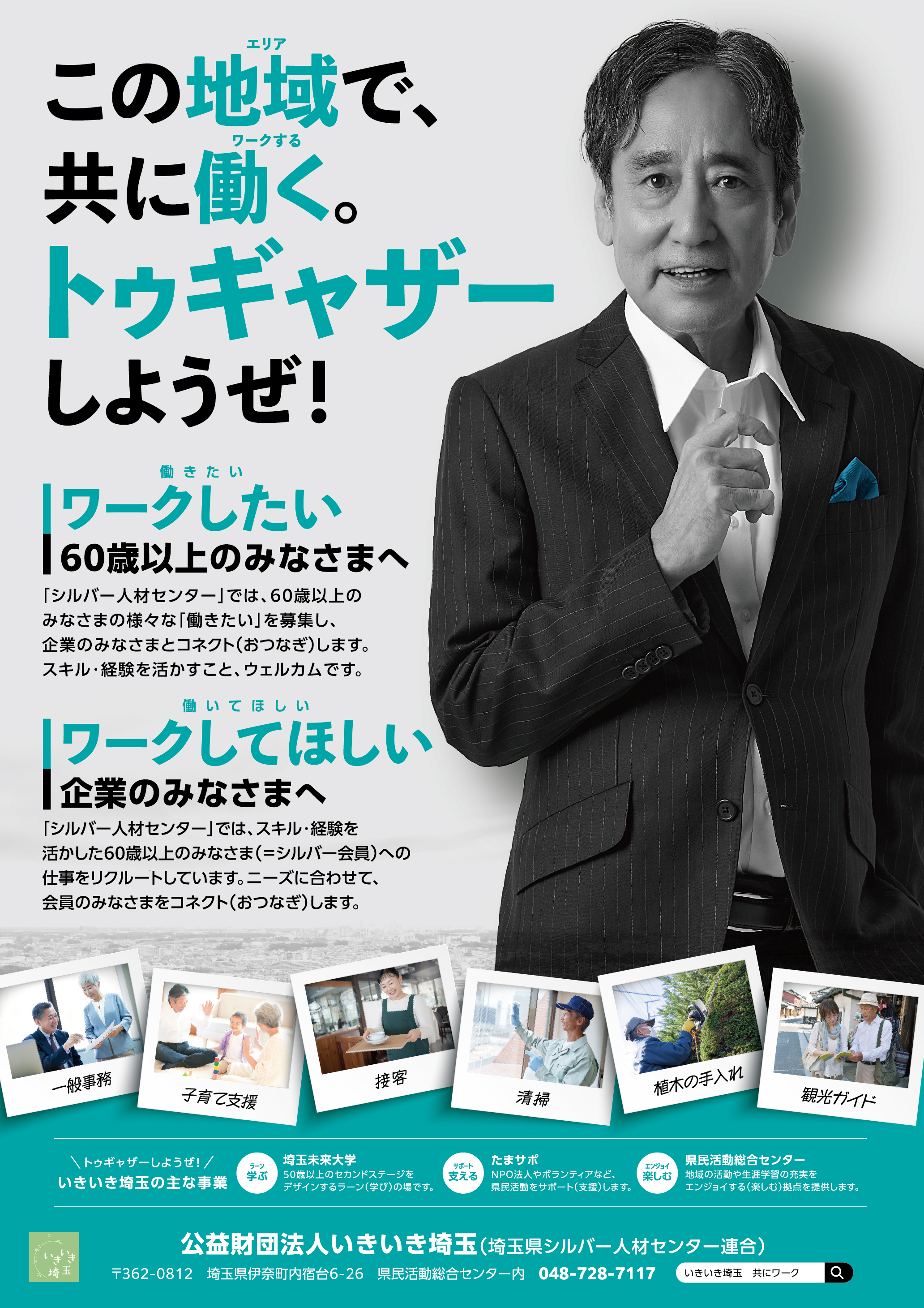 期間中は、TVCM(テレビ埼玉)、ラジオCM(FM NACK5)、新聞広告、WEB広告などを通じて、埼玉県のシニアのみなさまと、企業のみなさまなどに向けて「この地域(エリア)で、共に働く(ワークする)。トゥギャザーしようぜ!」というメッセージを発信していく予定です。