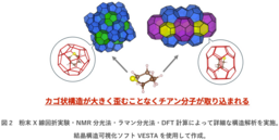 さらに、粉末X線回折実験による結晶構造解析、NMR分光法によるゲスト分子のカゴ状構造内の占有比の評価、ラマン分光法とDFT(密度汎関数理論)計算に基づく第一原理計算によるコンフォマー解析を組み合わせて分子配置を精密に調べた結果、カゴ状構造内にあるチアン分子はいずれの構造においても同じ椅子型構造をとっており、カゴ状構造に過度な歪みも見られませんでした(図2)。つまり、チアン分子は無理に取り込まれるのではなく、あくまでも自然に両方の構造に適合していることがわかりました。