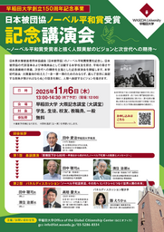 早稲田大学創立150周年記念事業として初の大規模講演会 ノーベル平和賞受賞者と描く人類貢献のビジョンと次世代への期待【11/6 13時より】 - 原爆投下から80年の節目で、平和の尊さと世界人類の未来-