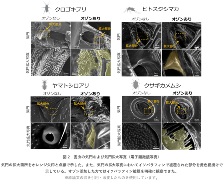 次に、その死亡率の上昇と死亡時間短縮のメカニズムを解明するために、走査電子顕微鏡(SEM)による気門の観察を行いました。その結果、オゾン添加によって気門周辺および気門内部におけるイソパラフィンの被覆箇所が増大している様子が観察されました(図2)。気門から体内につながる気管についても観察をしましたが、気管の形成に大きな違いは見られず、気門封鎖の効率化がオゾン添加イソパラフィンの高い殺虫活性の要因であると考えられます。化学反応性の高いオゾンがイソパラフィンと相互作用することで、その粘性等に影響を与え、気門をふさぎやすくなったものと考えられます。
