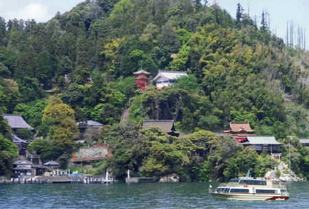 竹生島クルーズ(写真右)は、湖東の長浜港と湖西の今津港どちらからも乗船でき、パワースポット巡礼のほか、周辺観光と併せて、びわ湖を横断する湖上交通としても利用されています。