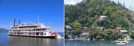 ミシガンクルーズ(写真左)は、赤いパドルが印象的な外輪船で南湖を周遊します。眺望はもちろん、楽しい音楽や多彩なお食事などが楽しめる、滋賀を代表する大型観光船です。