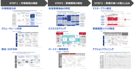 バリューチェーン分析、市場ポテンシャル・競合分析、潜在顧客・競合・パートナーヒアリング、KSF分析、事業機会の洗い出し評価、ビジネスモデリング、計画への落とし込みなどを行います。