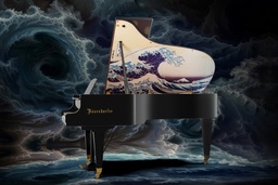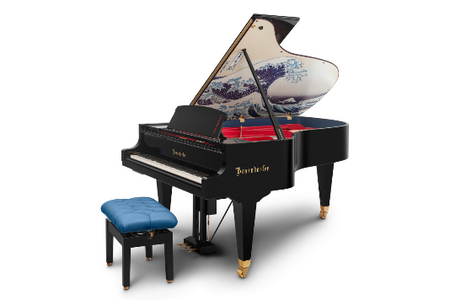 本モデルは、江戸時代に活躍した浮世絵師 葛飾北斎の作品「神奈川沖浪裏」をモチーフにした、全世界で16台の限定生産です。ピアノの屋根の内側には、葛飾北斎の浮世絵揃物「富嶽三十六景」の中でも最高傑作と呼ばれる「神奈川沖浪裏」が描かれています。さらに、自動演奏機能を搭載し、ベーゼンドルファーアーティストやラフマニノフ、ルービンシュタインといったピアニスト本人による演奏データなど1,000曲以上のコンテンツをお楽しみいただけます。