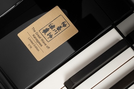ピアノの屋根の内側には、葛飾北斎の代表作「神奈川沖浪裏」を描き、ピアノの側板の内側には作品の色彩テーマを継承し、プルシアンブルーをあしらっています。また、ピアノのフレームと譜面台に施された葛飾北斎の署名は赤色で、日本文化における赤色の持つ特別な意味が反映されています。さらに、鍵盤左側の拍子木部分にはシリアルナンバー入りの真鍮プレートが埋め込まれています。