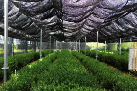 <実際の生産現場風景>                          <営農型太陽光発電設備を活用した碾茶被覆栽培>